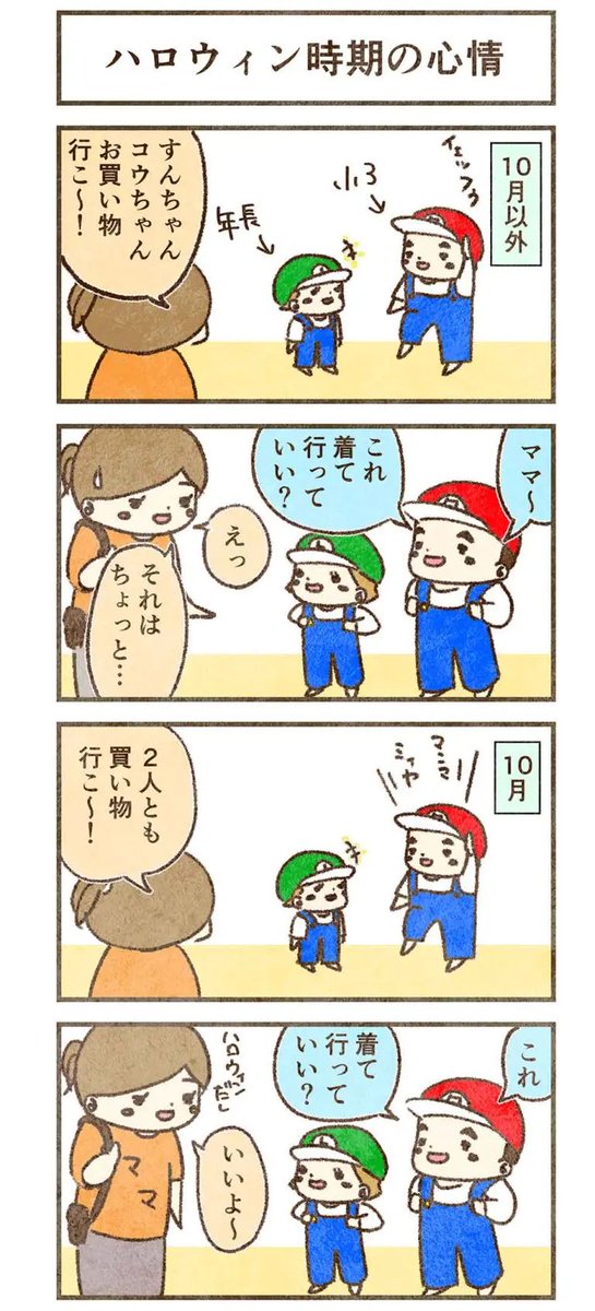 おはようございます(^^) ハロウィン時期関係なく大体コスプレしてる我が家ですが、やっぱりハロウィン時期の方が堂々と出来るというか、そんな感じがします😌 今日も良い日になりますように🌱 #育児漫画 #4コマ #Halloween #コミックエッセイ #マリオ #漫画が読めるハッシュタグ #おは戦41028ok 🍻