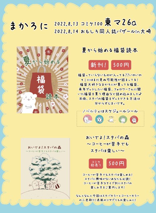 #C100 東マ 26a まかろに お品書き #おもしろ同人誌バザール in 大崎 新刊は年末に向けた福袋準備本!ご購入いただいた方には先着でノベルティがあります。既刊も持っていきますので、是非遊びに来てください😍