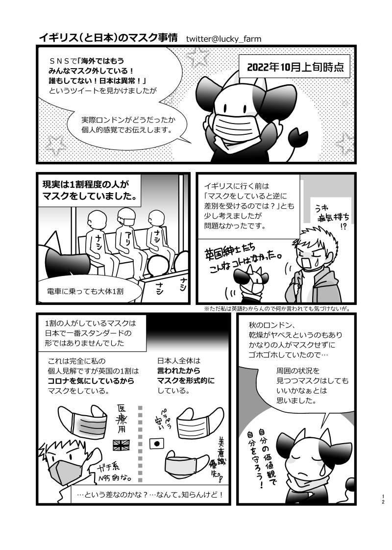 10月上旬にイギリス旅行に行った時の、ロンドンのマスク事情を完全個人的感覚で描きました。 「イギリスの人たちは本当に誰もマスクしてない」のか? 参考程度によろしければ。 #漫画が読めるハッシュタグ #おもしろ同人誌バザール