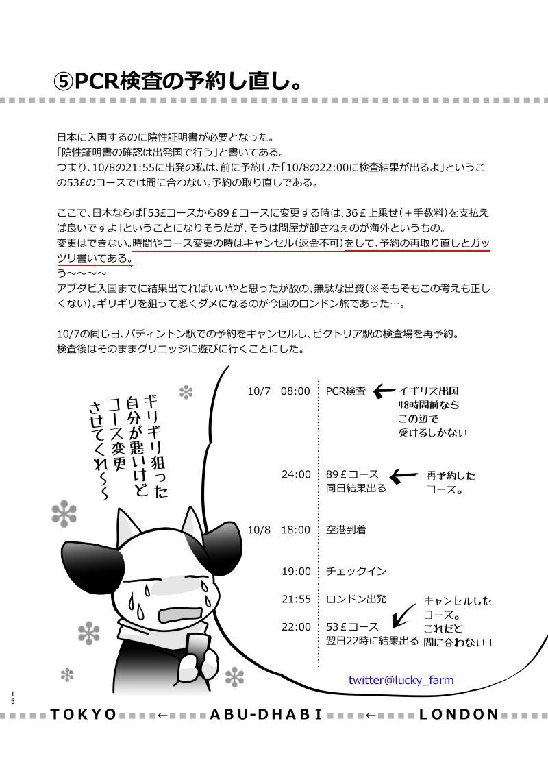 11/6 #おもしろ同人誌バザール 神保町 新刊です。 「コロナ関係の手続きをしないで海外旅行に行ってしまった話。」 P24/A5/1色折本 その名の通りのしくじり本。 漫画は計4ページ描きました。他、レポ文+カット+写真です。よろしくお願い致します! ※ルートは日本→UAE→英国です。