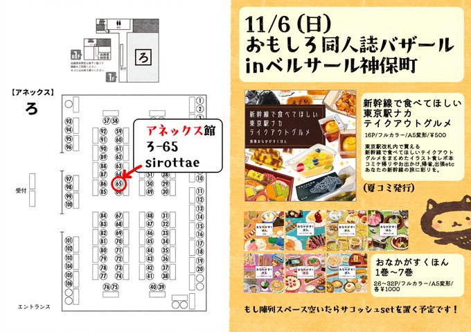 【イベント参加】 11/6(日)11時〜16時ベルサール神保町にて開催 #おもしろ同人誌バザール in神保町に参加します。 ブースNo【アネックス館】ろ-65 夏コミの新刊「東京駅ナカテイクアウトグルメ」と既刊、陳列スペース空いたらサコッシュsetを出します! ※入場料あり(1,000円)です。