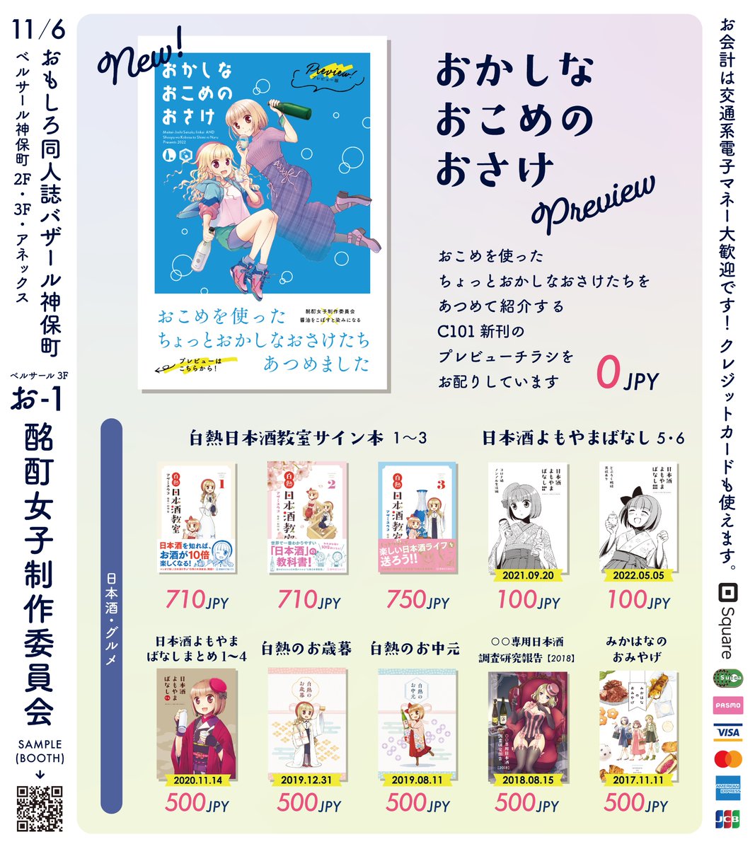 11/6 #おもしろ同人誌バザール ベルサール神保町3F お-1 酩酊女子制作委員会 自転車旅本と日本酒本を作っています。おもバザ初出しはコミケ新刊の「おかしなおこめのおさけ」プレビューチラシ・C101新刊の前日譚のコピー本・自転車旅ツールド実家・淡路島です。 #おもバザ