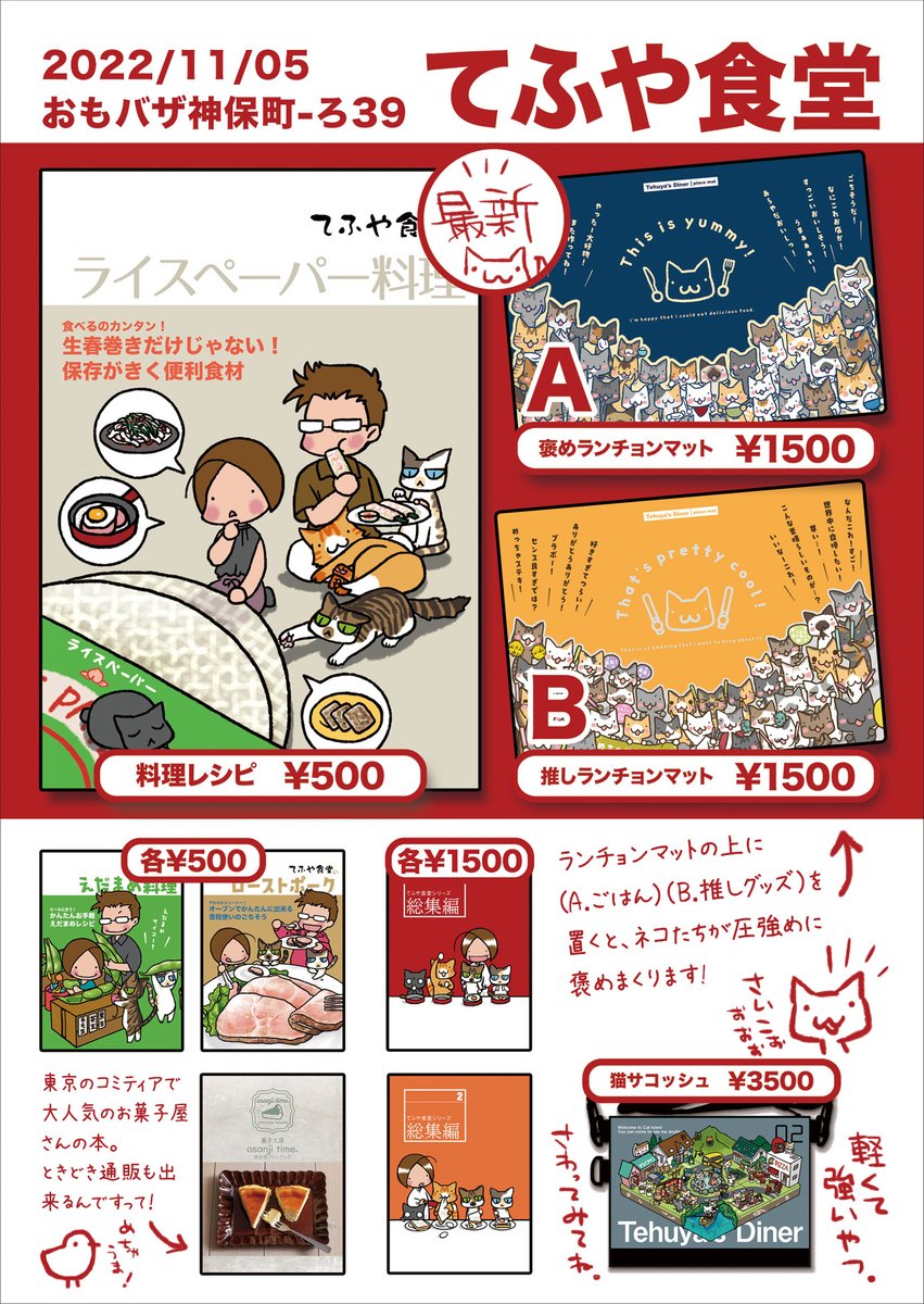 #おもしろ同人誌バザール 【お品書き】11/06 ろ39【てふや食堂】 簡単に作れる料理のレシピ本を作っています。 ライスペーパーを使ってソーセージ等を作る本と、置いたものをめちゃくちゃ褒めまくる2種類のランチョンマットが新作。ペーパーあります。 linkmix.co/7744662