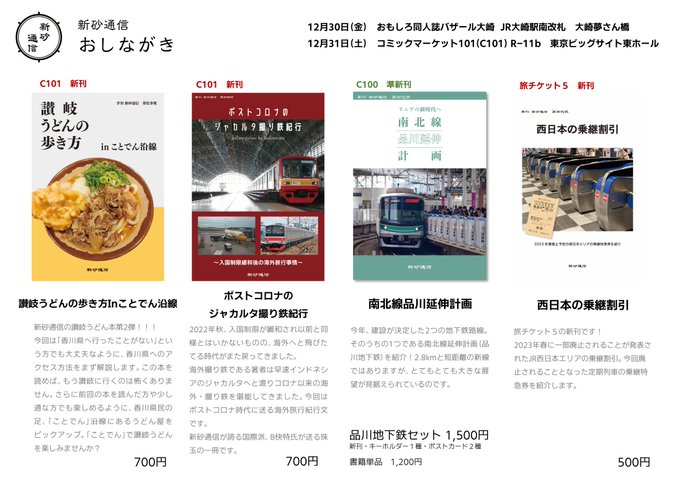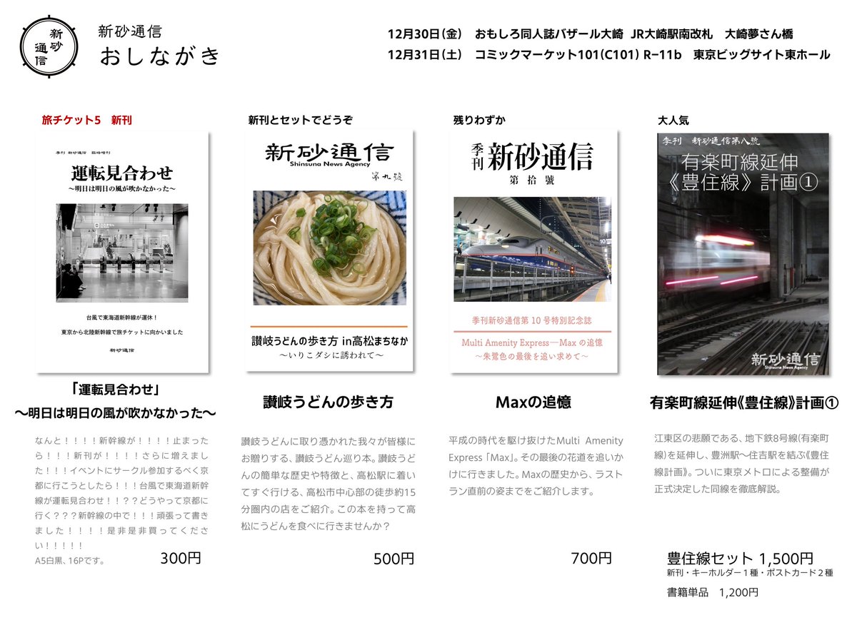 お待たせしました!おもバザ&C101のおしながきです!今回はなんと新刊が2冊!コミケ初頒布も含めると新刊が4種類!!もちろん通販もあります!! 是非お越しください BOOTH→shinsuna-tsushin.booth.pm #おもしろ同人誌バザール #鉄道島 #C101