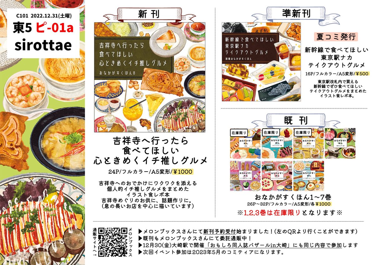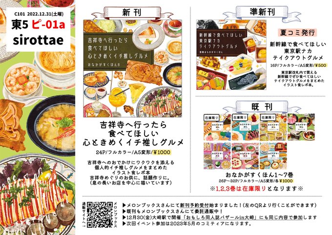 #c101 1日目の明日12/30、JR大崎駅南改札前で開催の #おもしろ同人誌バザール に参加します。 ラインナップは31日とおなじ、新刊も持っていきます!冬コミの行き帰りにお立ち寄りいただければ嬉しいです! 開始時間は(続く)↓ #大崎コミックシェルター