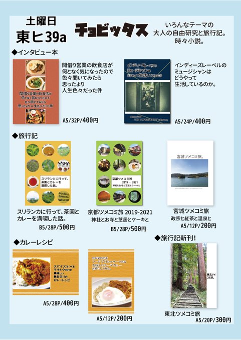 今頃ですが、30日と31日のお品書き。新刊は無いですすいませんー。 明日はJR山手線大崎駅改札出てすぐの #大崎コミックシェルター 内の #おもしろ同人誌バザール に出てます。 明後日はコミケ。東ヒ39aです。よろしくお願いします。#コミックマーケット #C101お品書き