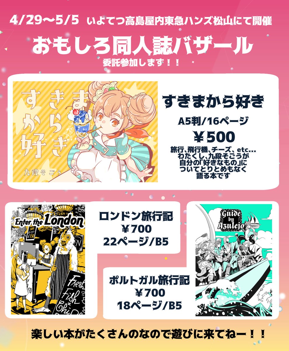 4/29~5/5の間いよてつ高島屋内東急ハンズ松山にて開催されるおもしろ同人誌バザールに委託で参加します。今回はこの3冊を持っていきます。お近くの方はぜひーー!! #おもしろ同人誌バザール #おもバザハンズ松山