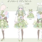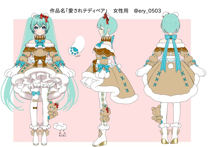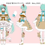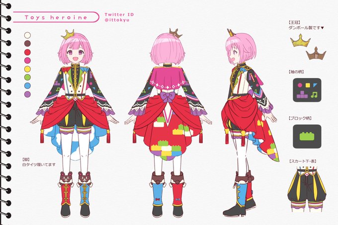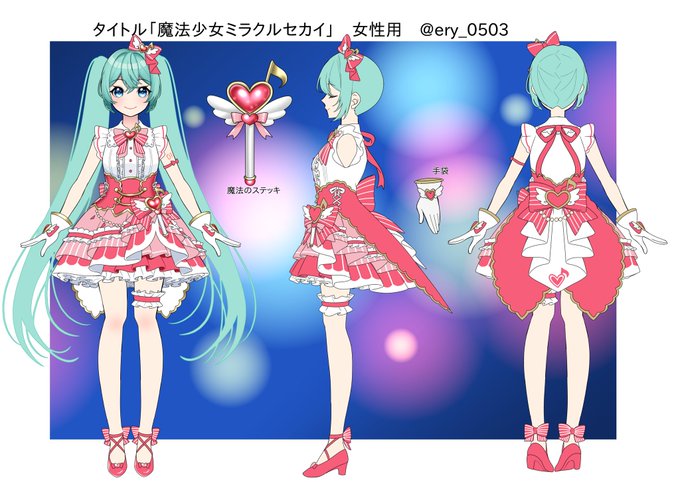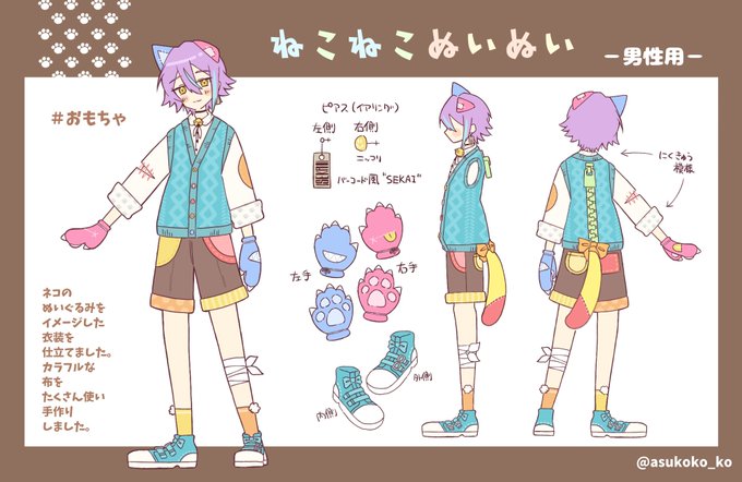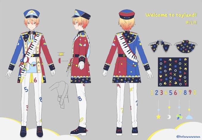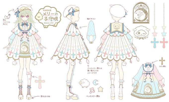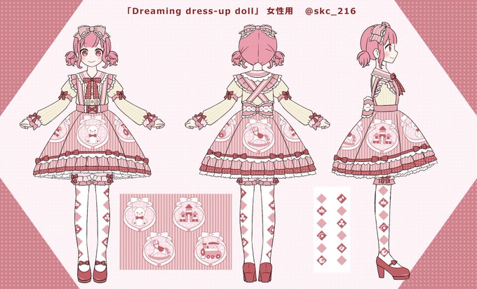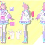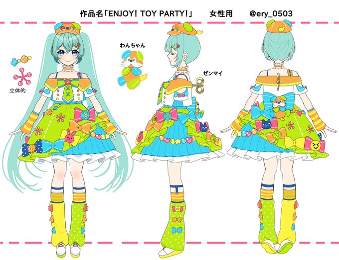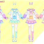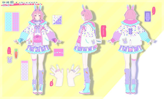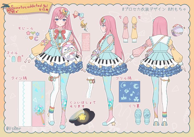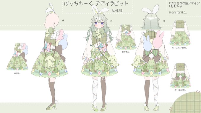 女性用「らびっとぱすてる」 うさぎのぬいぐるみをイメージしつつ、シールやおもちゃの指輪、スイッチやタグ、縫い目などで"おもちゃ感"を出しました。 よろしくお願いします🐰 #プロセカ衣装デザイン #おもちゃ