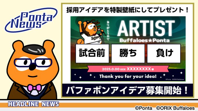\2025年シーズンもアイデア大募集⚾/ 今シーズンも #バファポンアイデア募集 がスタートしました! あなたのアイデアで #おりほー をつかみ取れ ご応募お待ちしております✨ 採用者には、特製デジタル壁紙をプレゼント😊 👇くわしくはこちら👇 ponta.jp/c/buffaloes/#S… #バファローズポンタ