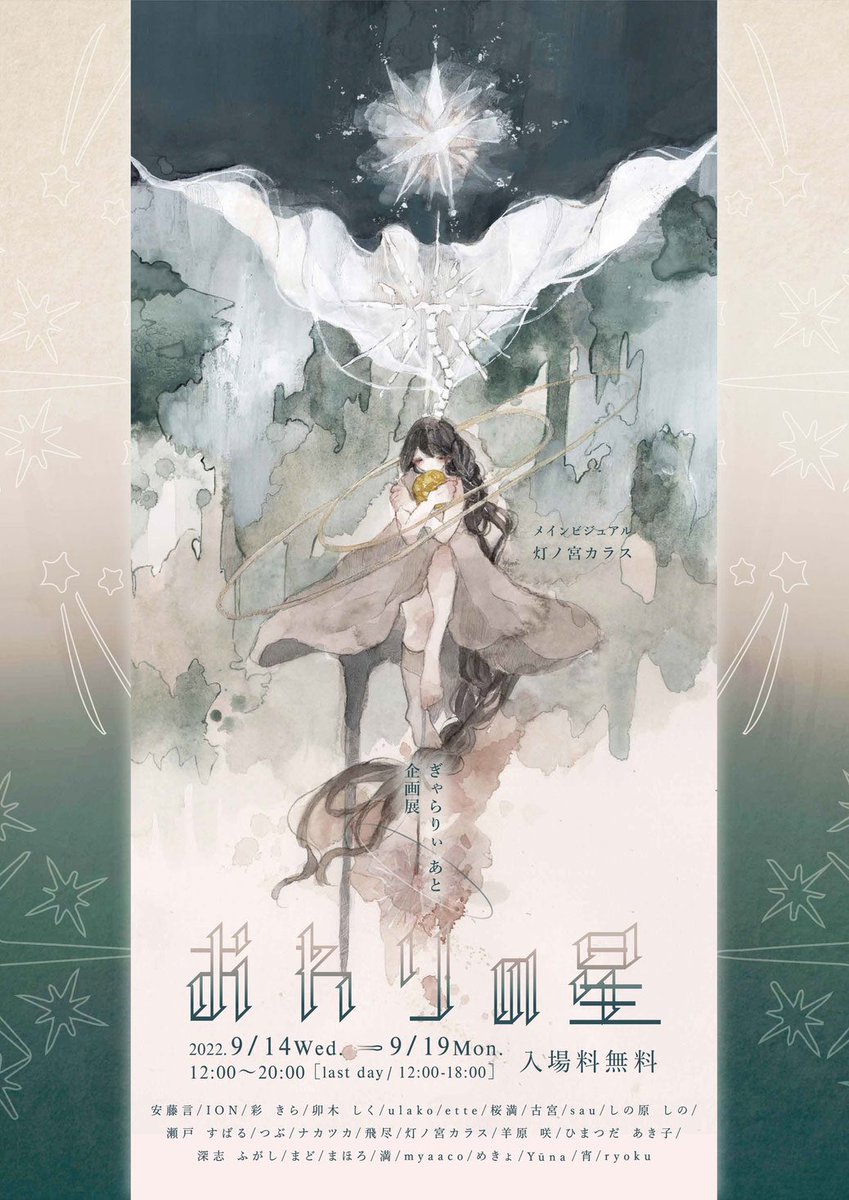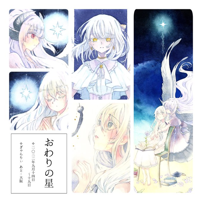 📢おしらせ💭 企画展『 #おわりの星 』 ✴︎2022.9.14(wed)~9.19(mon) ✴︎12時~20時(最終日~18時) ✴︎ぎゃらりぃあと様(大阪) 新作5点で参加しております🌟 今回、ドローイング2点もございます。 夜~朝の合間をお楽しみくださったら嬉しいです。 gallery-ato.jimdofree.com/%E3%81%8A%E3%8…