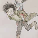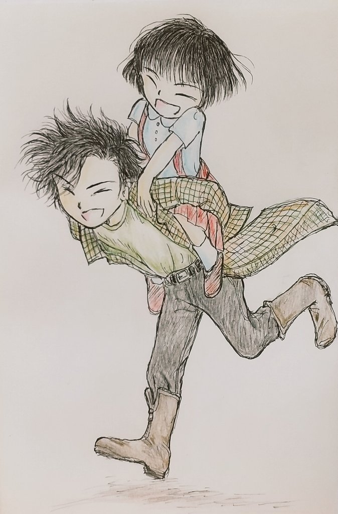 花子さんと京ちゃん あの子の世界が 色をつけてきた… あんまり笑うから 思わず走り出す #アナログイラスト #イラスト #イラスト好きな人と繋がりたい #絵描きさんと繋がたい #落書き #オリジナルキャラクター #おんぶ