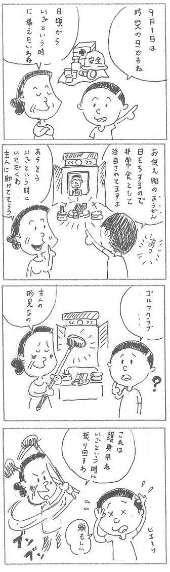 『お供えあれば憂いなし!?』 -グッドタイムリビング 4コマ漫画シリーズ- 介護スタッフの中村が、ご入居者との日常を4コマ漫画でお届け! gtl-daiwa.co.jp/company/misora/ #グッドタイムリビング千葉みなと駅前通 #有料老人ホーム #GTL4コマ漫画 #漫画が読めるハッシュタグ #防災の日 #お供え物 #形見