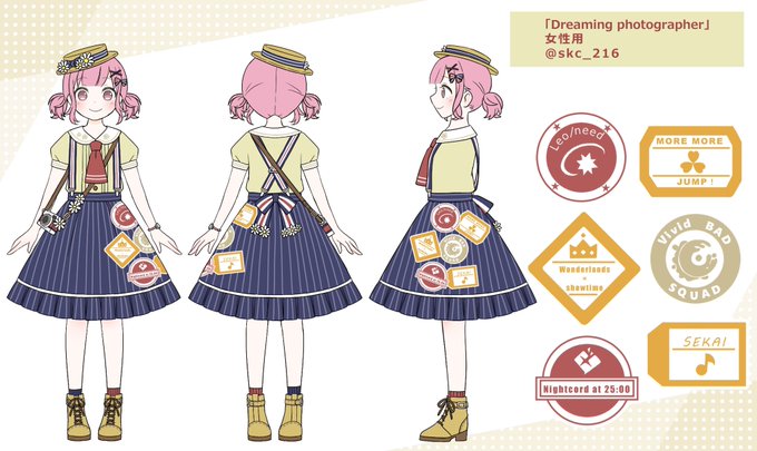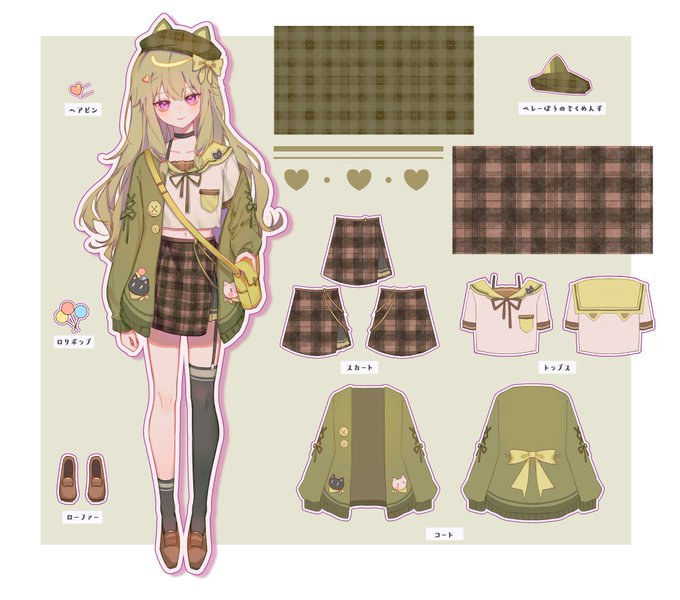 #プロセカ衣装デザイン #お出かけ服 女性用: 【カフェラッテ・トレンチスタイル】 トレンチコートをメインに、大人っぽくて可愛いコーデになるよう頑張りました🧥 所々に音楽関連のモチーフを入れているのがポイントです🎶 よろしくお願いします🙌