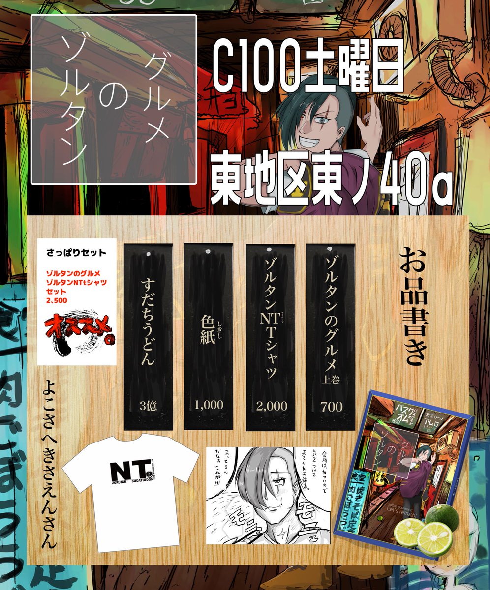 コミックマーケット100お品書きなんだなぁ!!これが!! 新作「ゾルタンのグルメ」だ諸君!!会場価格700円 さらに作中クソダサTシャツが 2000円で買えるぞ! さっぱりセットで本とTシャツで2500円🉐 土曜日東地区ノ40a !!当日は熱中症対策を万全な! #コミックマーケット100 #お品書き