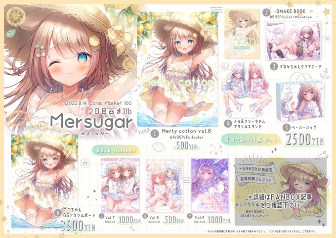 【#C100 #お品書き】 『Mersugar』 8/14(日) 東京ビックサイト西1【ま-11b】 夏コミ当日のお品書きになります! 宜しくお願いいたします🐶🍋 通販情報も含めてFANBOXの全体公開記事にまとめています! mersugar.fanbox.cc/posts/4255863 WEBカタログ🍋 webcatalog-free.circle.ms/Map#16209870/d…