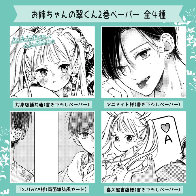 2巻の特典ペーパーまとめです🌱(TSUTAYAさんのは表面が翠くんと菖のカラー✨) 店舗共通対象店舗→m.box.com/shared_item/ht… TSUTAYA様対象店舗→ tsutaya.tsite.jp/store-list/202… #お姉ちゃんの翠くん