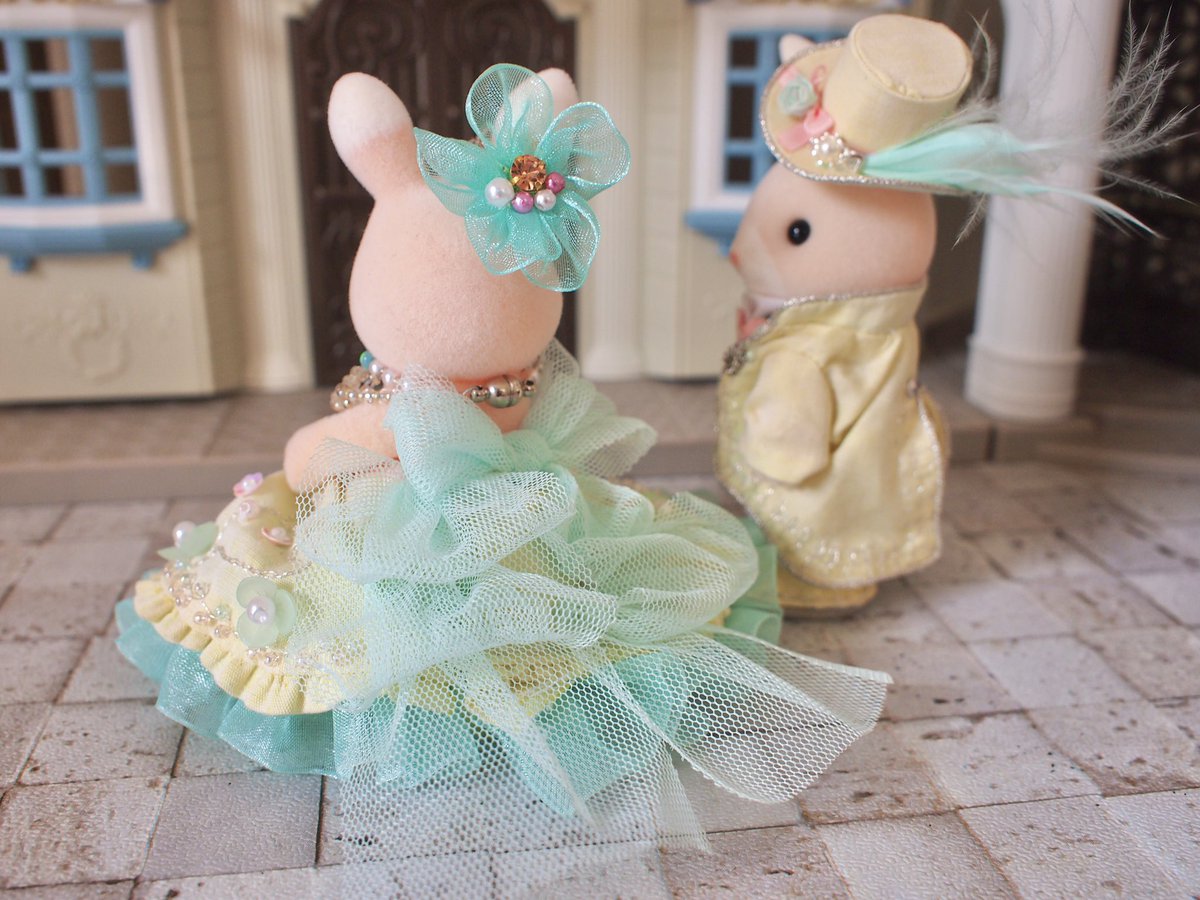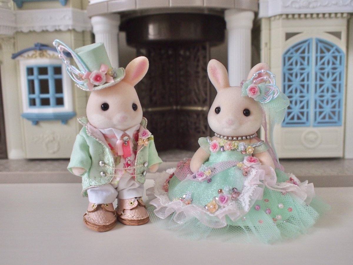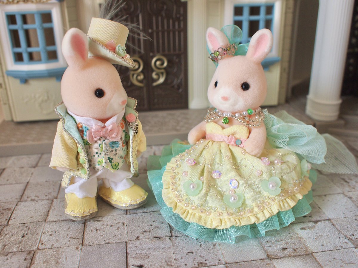 『春の訪れ』 春のイメージで、ドレス&タキシード 作ってみました。 つまみ細工で咲き始めた花を表現。 グリーンとピンクで優しい色合いに仕上げてみました。 明るい春のイメージ、伝わったら嬉しいです🌸 #シルバニアハンドメイドコンテスト #minne #お洋服部門 #トーカイ #シルバニアファミリー