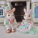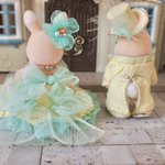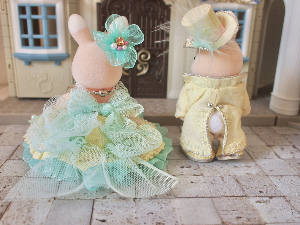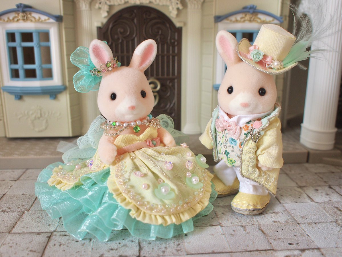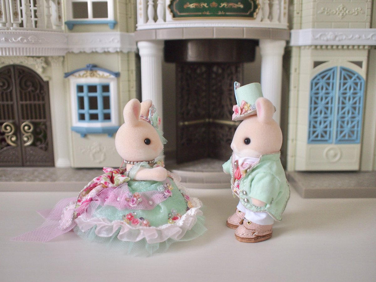 『春の訪れ』 春のイメージで、ドレス&タキシード 作ってみました。 つまみ細工で咲き始めた花を表現。 グリーンとピンクで優しい色合いに仕上げてみました。 明るい春のイメージ、伝わったら嬉しいです🌸 #シルバニアハンドメイドコンテスト #minne #お洋服部門 #トーカイ #シルバニアファミリー