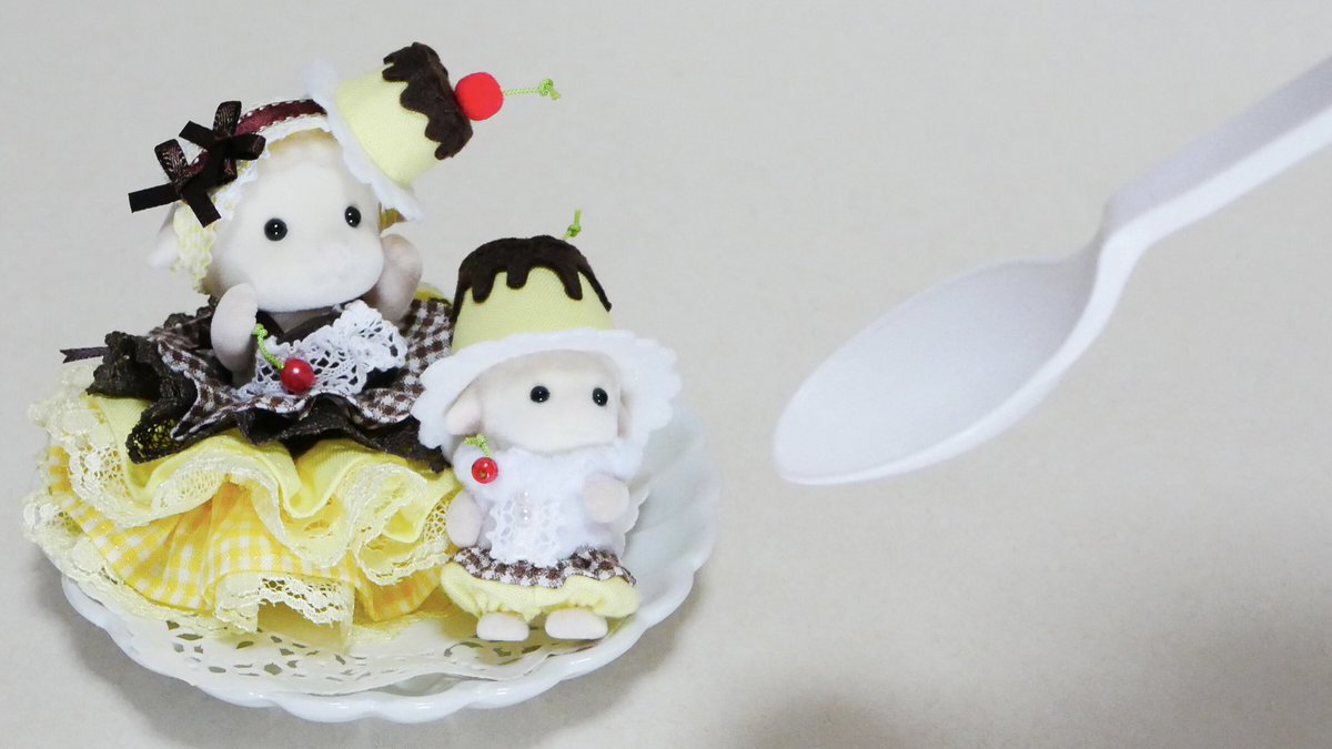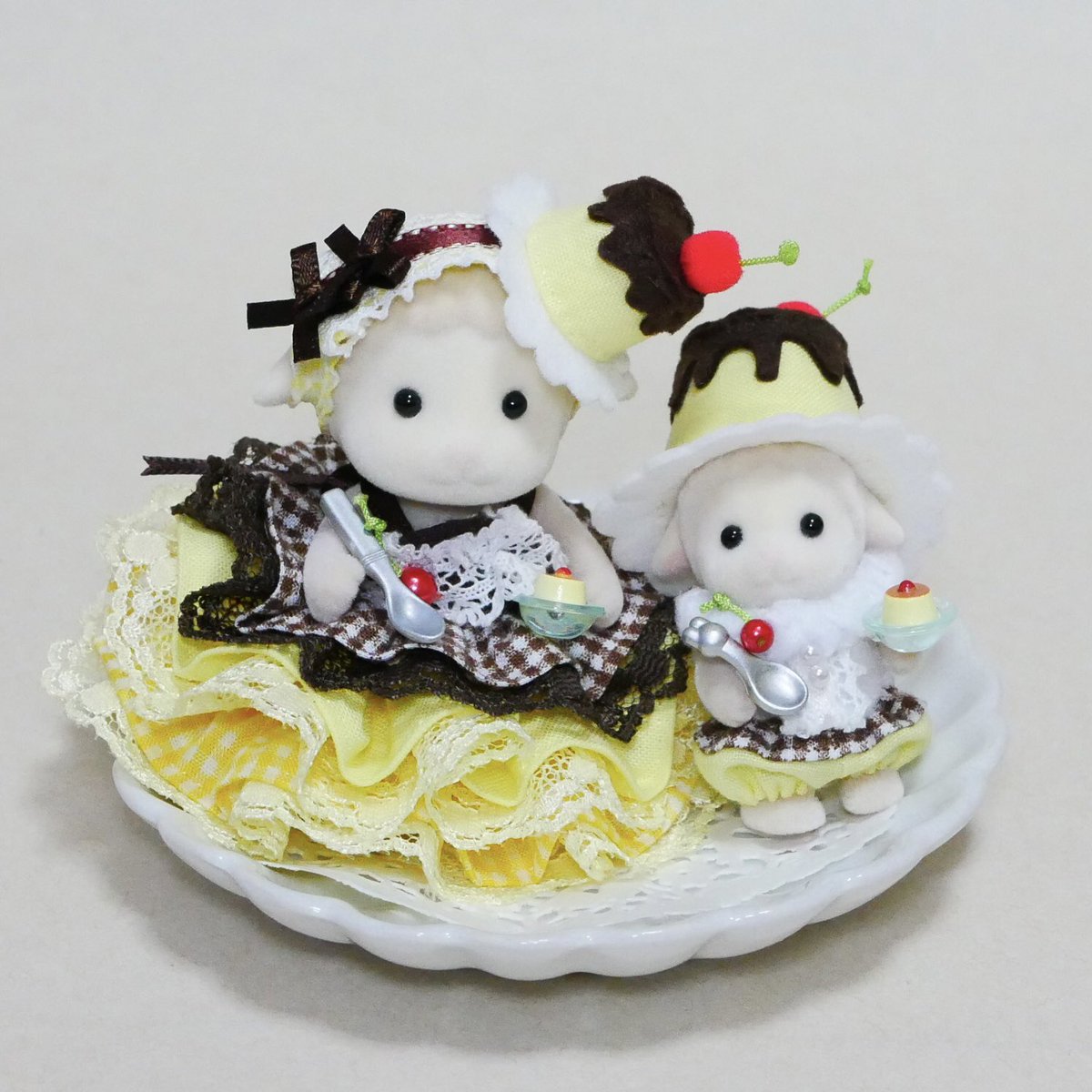 『食べちゃいたい‼︎プリンなお洋服』 プリンを表現したお洋服を作りました🍮 どちらもビーズと飾り紐で作ったさくらんぼをそえて🍒 「どうぞ、めしあがれ❤️」 詳細▶︎ instagram.com/p/CbPloYsvGWT/… #シルバニアハンドメイドコンテスト #お洋服部門 #シルバニアファミリー #minne #トーカイ