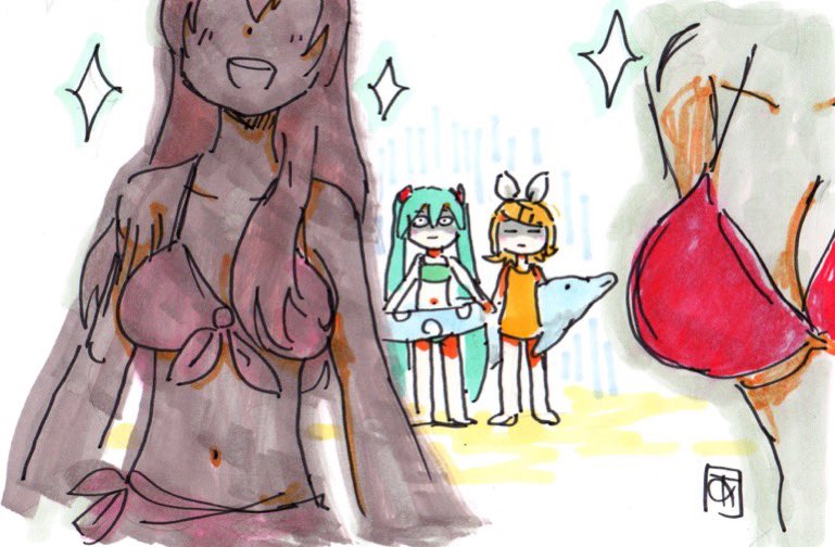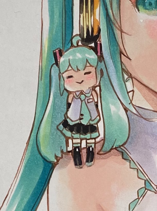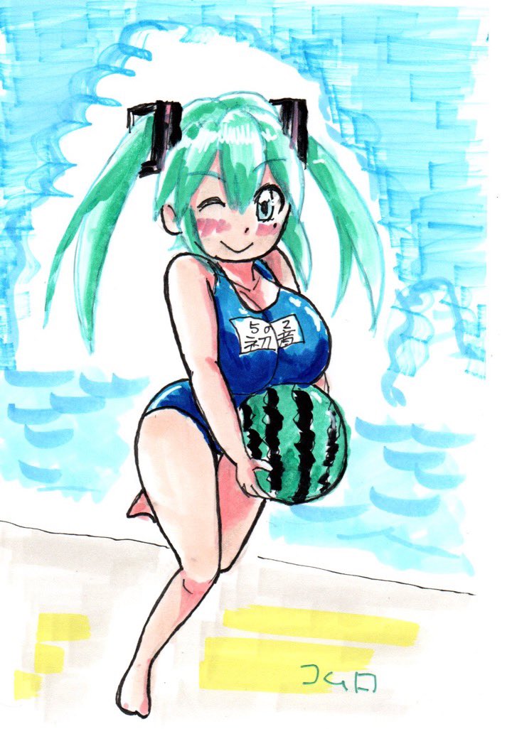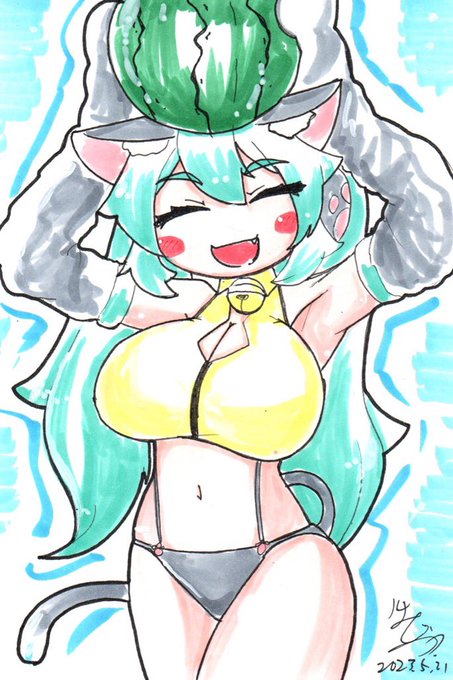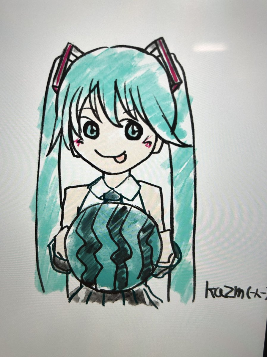 #お絵描きオフ会2023 お題「夏休み☀️」 ・つまつまさん(@tsumatsma ) 確かにマジミラは夏休み中…😂 チケット当たりますように❗️ ・kazmさん(@KKKKKKKqap ) おっきなスイカ🍉を抱えて、テヘペロなミクさん!夏は🍉だね!