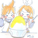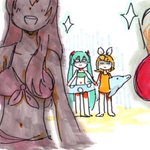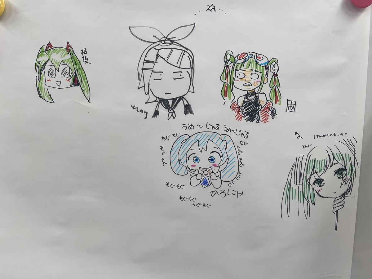 #お絵描きオフ会2023 なぜか対決モードのとしのり'sリンちゃんとあらがい'sクソビちゃん その様子を心配そうにみつめるmof 'sミクさんと、桔梗'sミクさん …そんな事は我関せずでドーナツ🍩を貪り食うじゅるり((´∀`*))ヶラヶラ 中の人ひろにゃさんも一心不乱にドーナツ貪り食ってました(コラ)