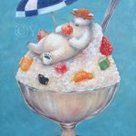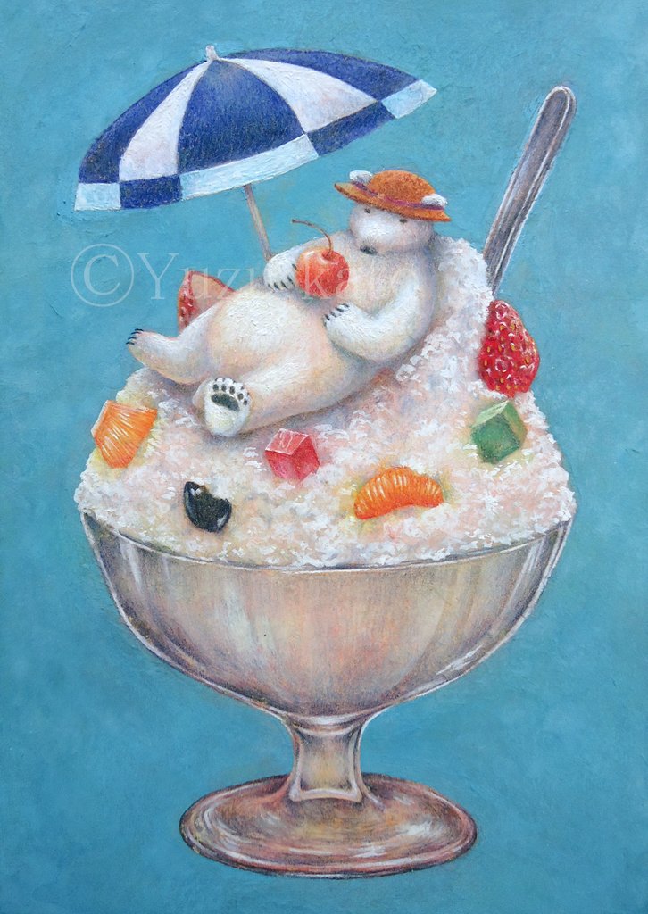 #かき氷の日 ということで…大学出たばかりの頃に描いた古い作品ですがご紹介します。現在開催中の企画展 #お蔵出しチャリティ展 にてこちらのポストカードを特別価格で販売しております。どんどん夏らしく暑くなりましたので、視覚から涼やかになって頂ければ幸いです🍨