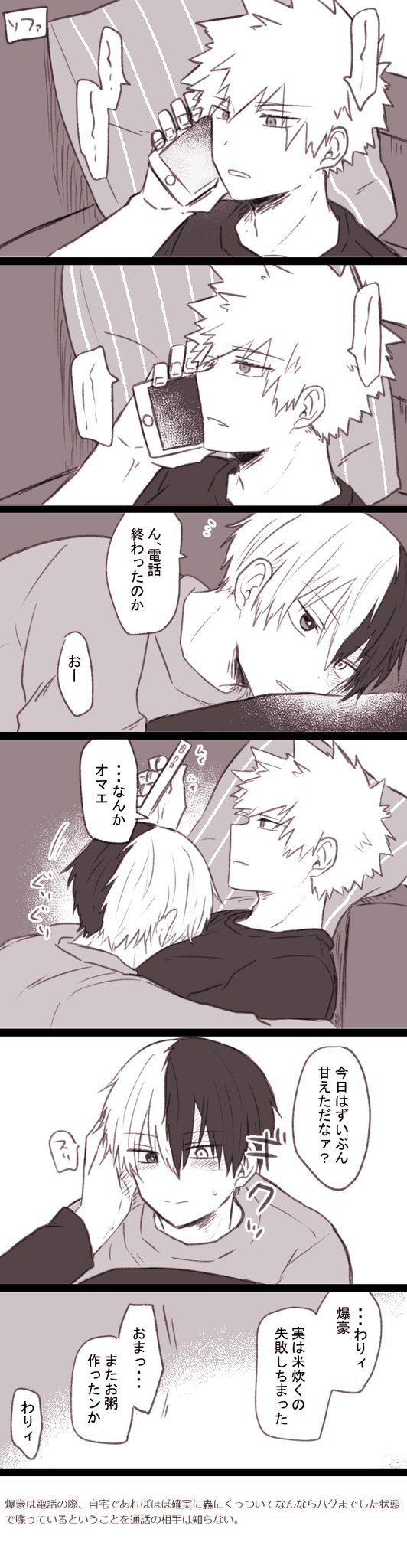 💥は電話の際、自宅であればほぼ確実に🍰にくっついてなんならハグまでした状態で喋っているということを通話の相手は知らない。 #お題ガチャ #同棲カプのゆるい話 odaibako.net/gacha/2563?sha…