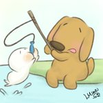 22/9/23 釣りを楽しむわんくん🐾 よしっ、大物が釣れそうだぞっ🎣💨 思いっきり引っ張ってー! ってあれっ、おもちじゃないか💦 #おもちの日々 #釣り #愛犬 #お餅好きと繋がりたい #ゆるいイラスト #ゆるキャラ #イラスト #ART_RT #sns秋の芸術祭2022 #絵本作家 #NFTartist #2コマ