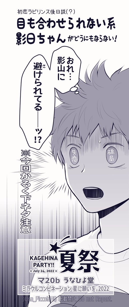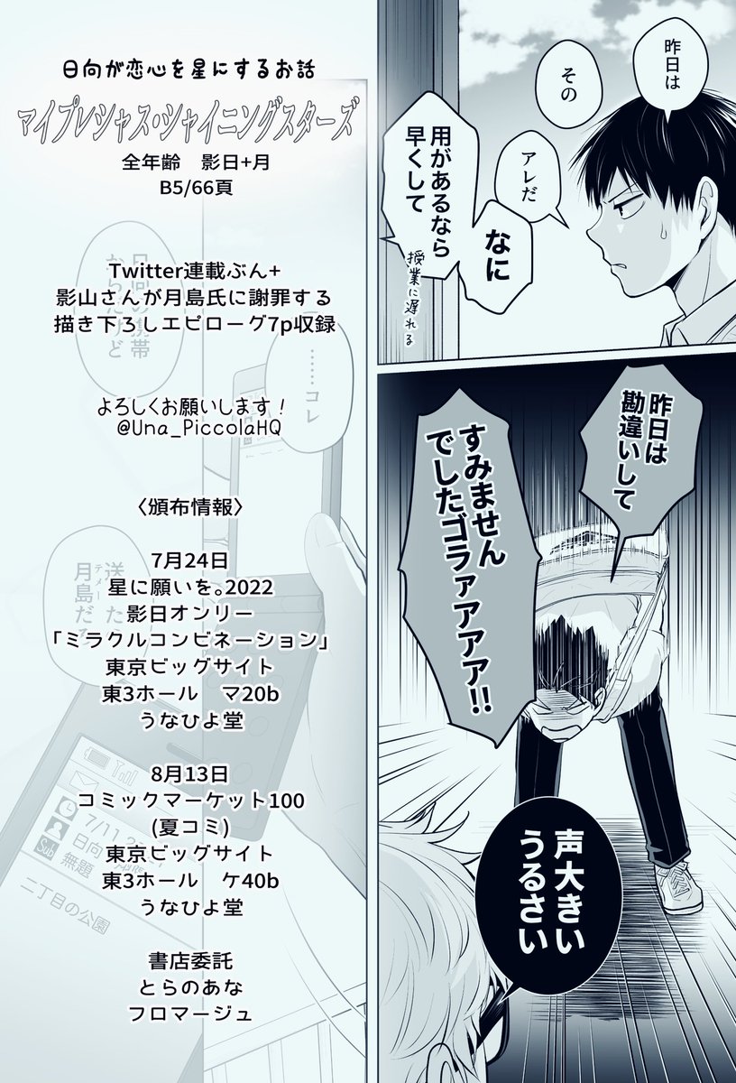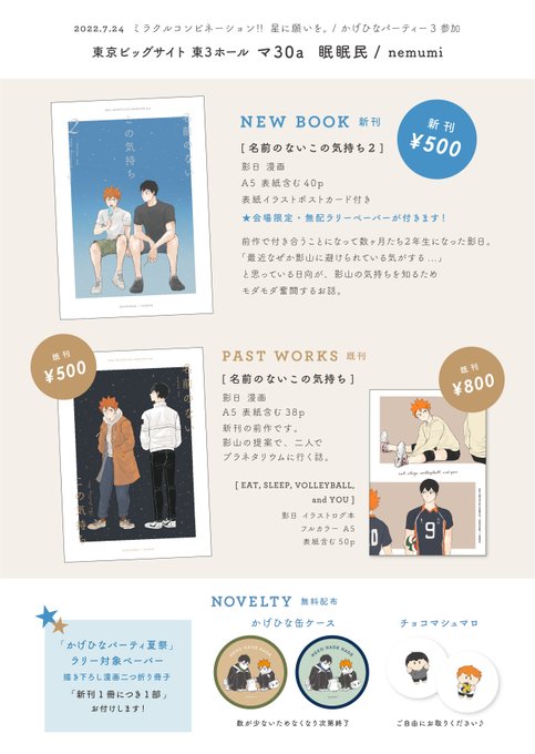 7/24ミラコン 新刊 「名前のないこの気持ち2」 A5 40p 全年齢 前回のお話の続きになりました🍧 高2になり少しずつ変わって行く夏のある日、お互いの気持ちを探してモダモダする影日のお話です。 サンプル▼ pixiv.net/artworks/99736… ポストカードとペーパーお付けします⛱ #かげひなパーティ夏祭