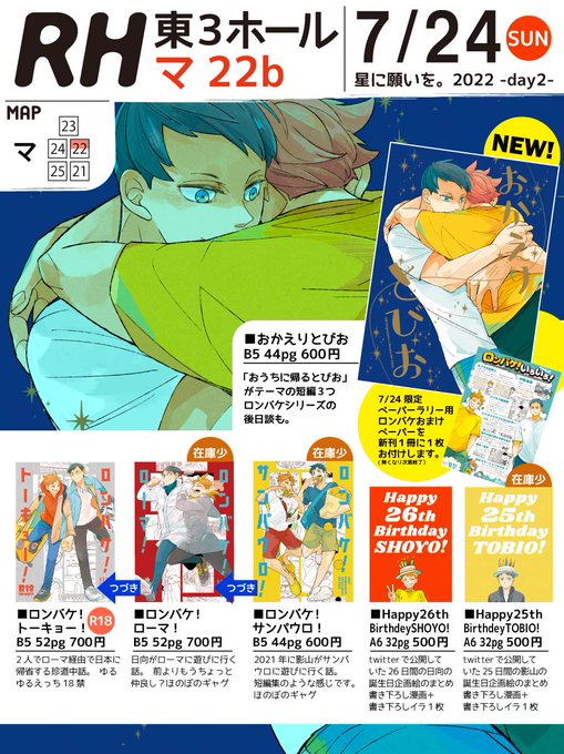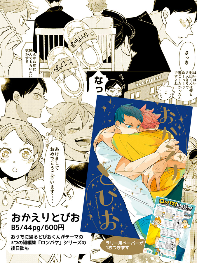 ■7/24 マ22b RH ミラコン新刊 「おかえりとびお」 B5/44pg/600円(※会場価格)おうちに帰るトビヨがテーマの3つの短編集 それぞれ影日の関係性が違う感じです。「ロンバケ」シリーズの後日談も。ラリー用ペーパーが1枚つきます。 ecs.toranoana.jp/joshi/ec/item/… #かげひなパーティ夏祭