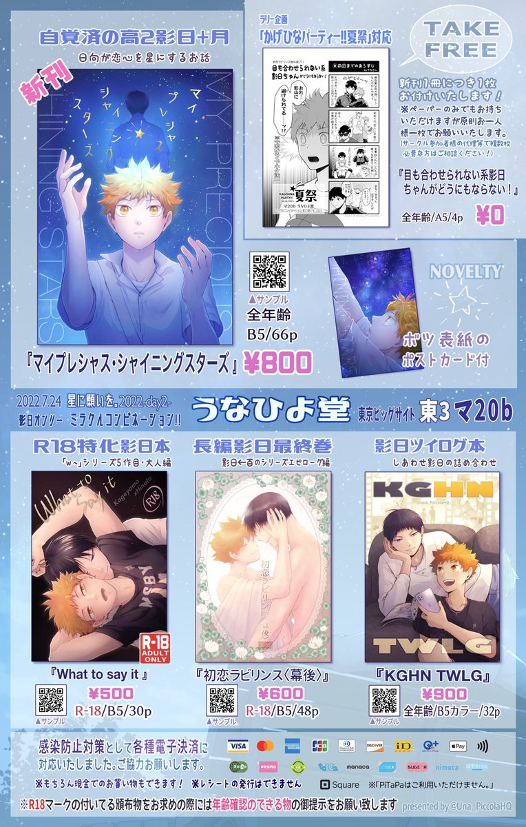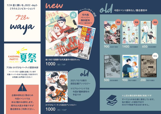 7/24のお品書き&既刊の委託情報🌟 pixiv.net/artworks/99913… #かげひなパーティ夏祭 本部に場所を大きく取るためイベントでは新刊と前回アンソロのみの頒布です📚 ペーパーのみでもお持ちいただけますのでラリーの足しにもどうぞ!(おひとり1枚まで) 既刊委託👉ecs.toranoana.jp/joshi/ec/cot/c…