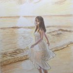 #かっきーとカウントダウン 賀喜遥香ちゃん1st写真集発売まであと 11日! 70枚連続賀喜絵、59枚目は 先行カットから、夕陽の渚に立つ姿。遠景で全身描いたのは、初めて。 #賀喜遥香1st写真集まっさら #色鉛筆画 #乃木坂46 #N46_FA