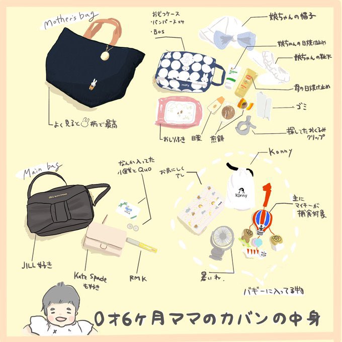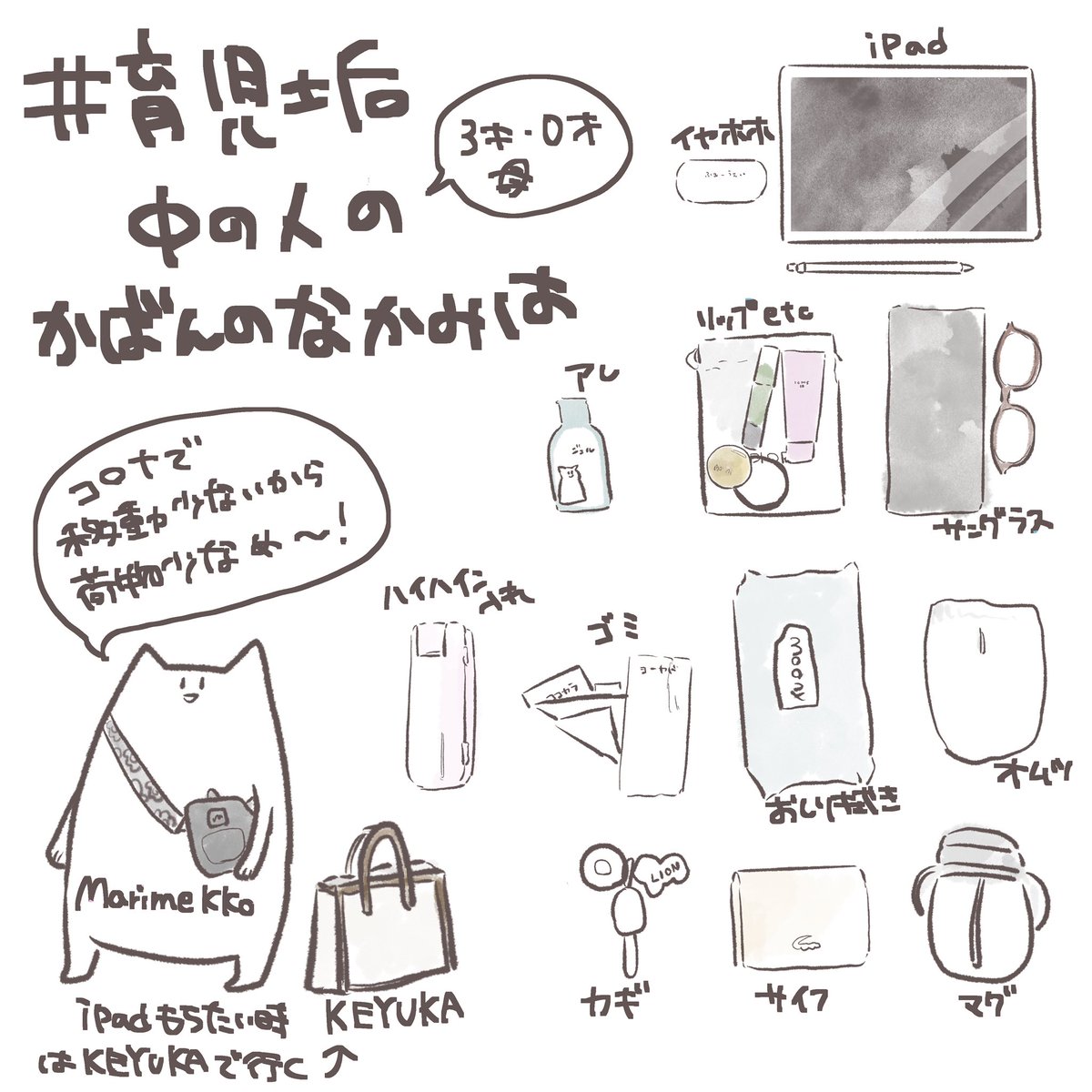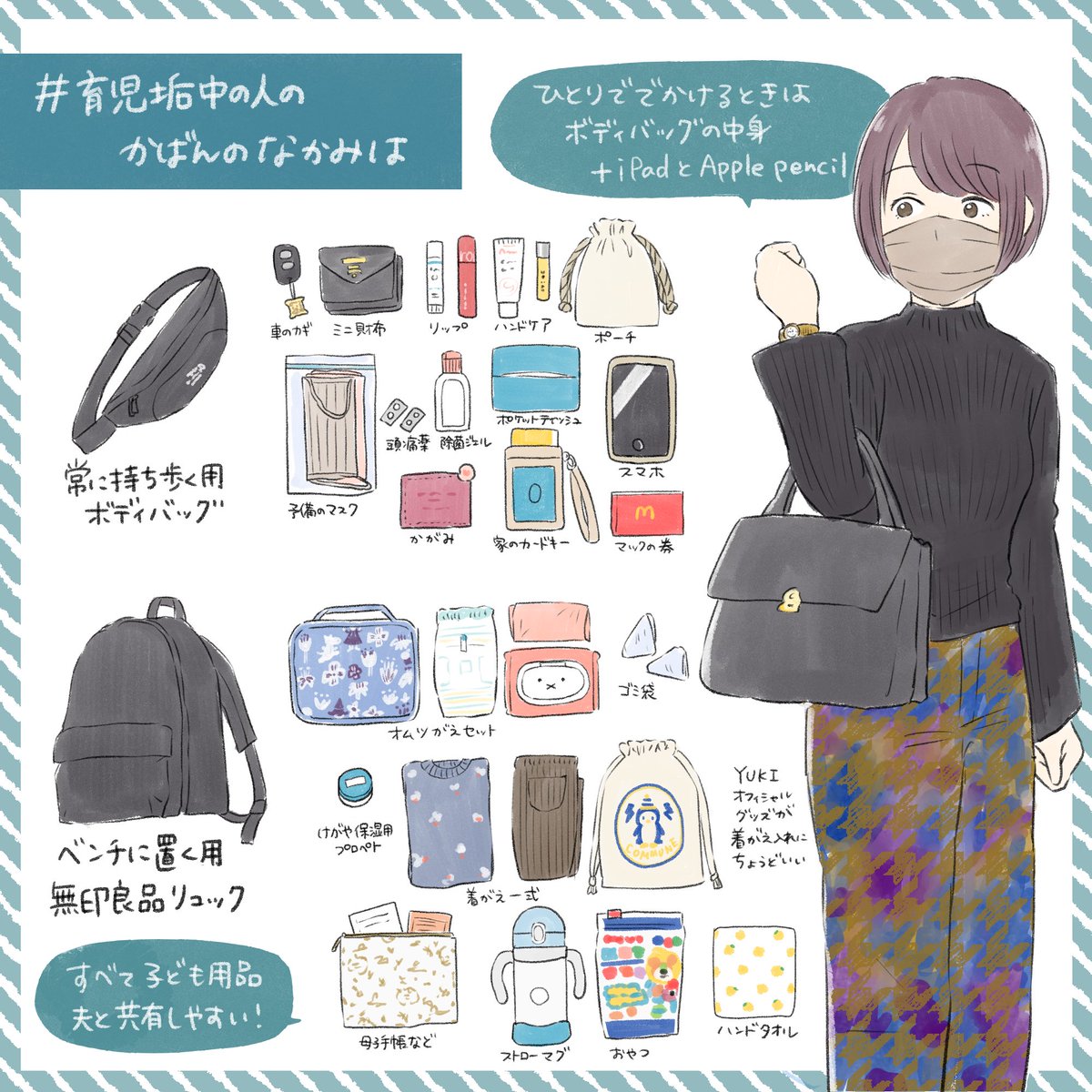 息子とお出かけする時は自分と息子の荷物を分けるために2つバッグを使っているよ!夫に息子の面倒を見てもらう時はそのままリュックごと渡したいので、マザーズバッグは男の人でも使いやすいシンプルなものを選ぶようにしてる! #育児垢中の人のかばんのなかみは #かばんのなかみは #育児絵日記