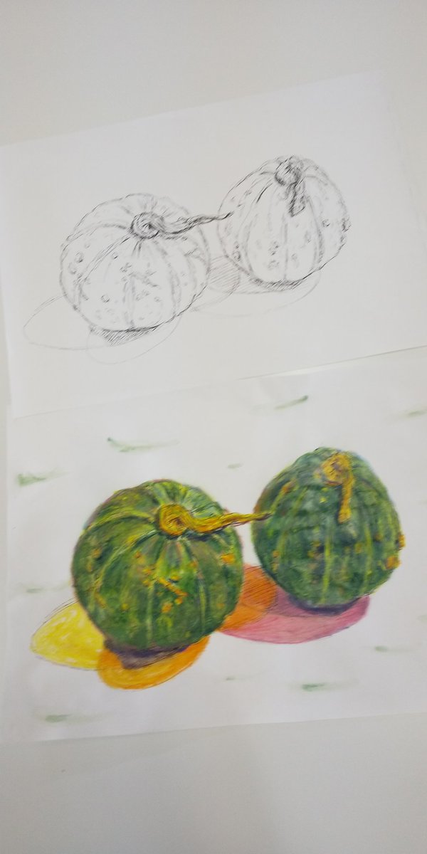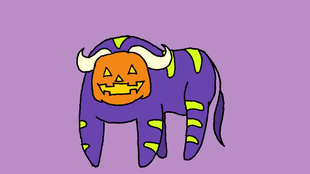 お盆に帰ってきたけどハロウィン過ぎても全然戻らない先祖の霊。 ずっと居すぎて精霊馬と合体して、ほぼバケモノになってる #イラスト好きな人と繋がりたい #絵描きさんと繫がりたい #ハロウィン #かぼちゃ #精霊馬 #お盆 #オリキャラ