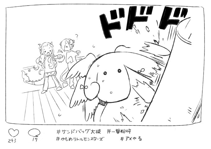 【えぐるように うつ】 三匹のモンスター達がトレーニングをしている。 まさか戦闘訓練…!? 誰かをボコボコにする予定があるのかもしれない。 モンスター恐るべし……。 #かもめモンスター保育園