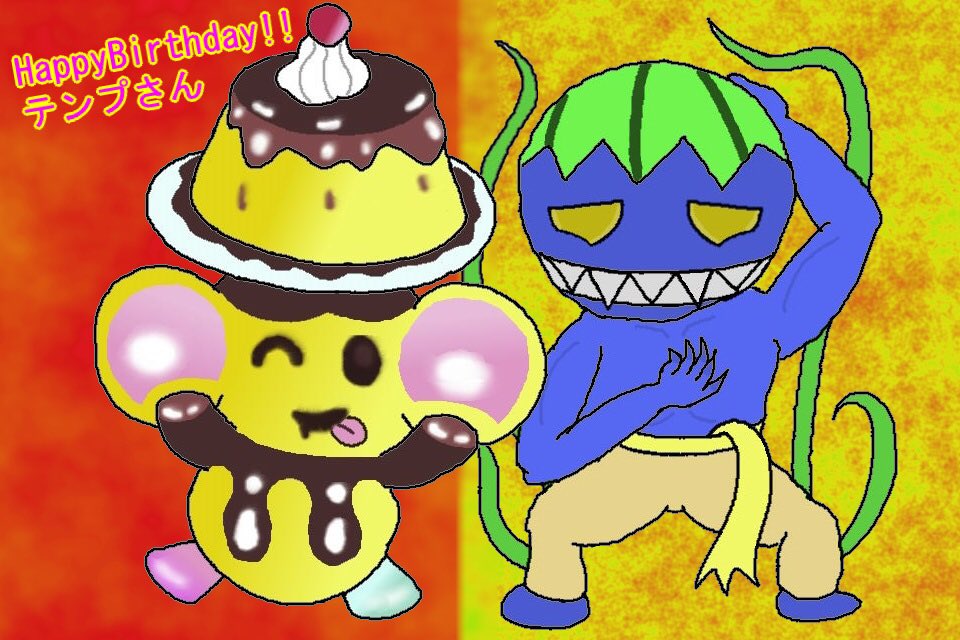 テンプ さんへ @DDAxdkqBMH2RxBE 誕生日おめでとうございます! お祝いに #からめるふぁんあーと と、初めてお会いした時のスイカさんも合わせて描いてみました。 専門学校でご多忙な日々を送られている中でVtuberにゲーム『モンスターテイマー』制作と精力的に活動なされる貴方を今後も応援します