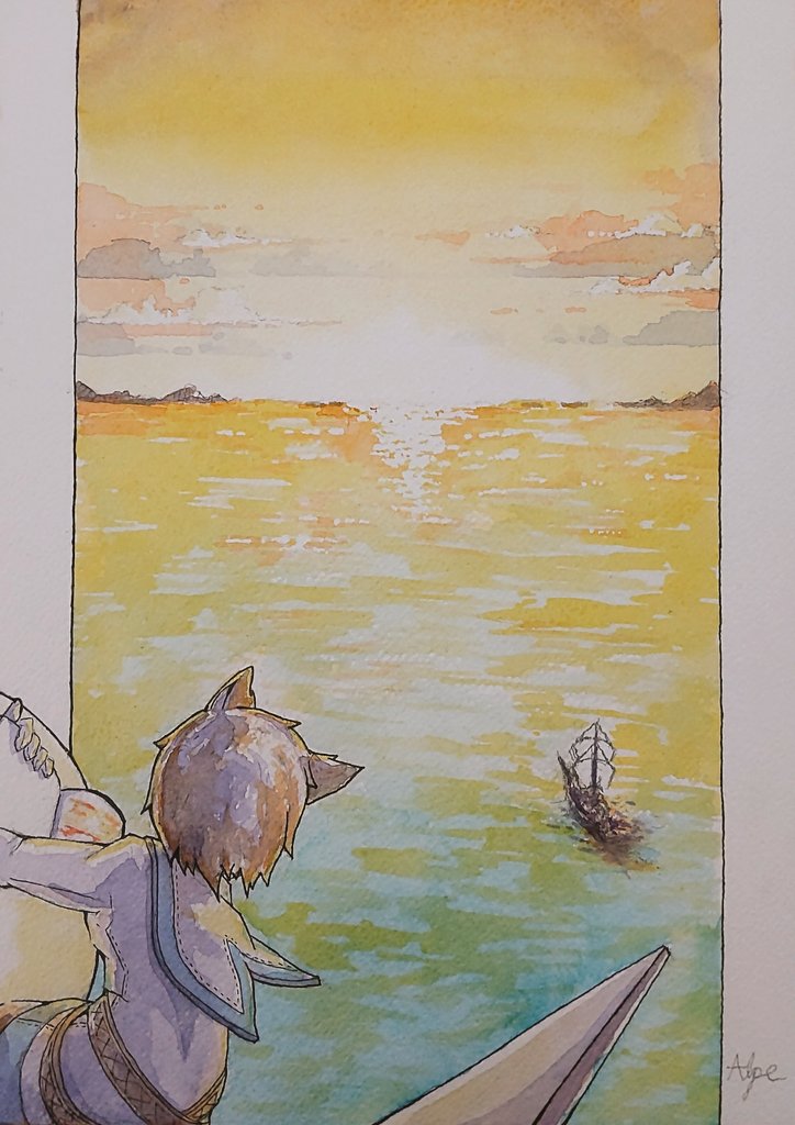 4枚描けたんで並べてみたら どーでしょ 何となく物語っぽくなったかな? 1枚目以外はペン入れしたので 見やすくなってる気がする 次は夜空と月 1ヶ月1枚の締め切りまでに 線画くらいは終わらせたい #がじゅうのえかき #透明水彩 #Watercolor