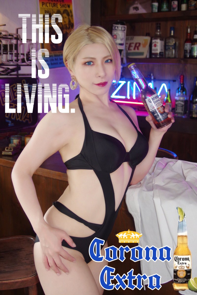 【cosplay】※捏造水着 スタジオのバーセットに置いてあったコロナビールを持ったら広告っぽくなったので雑に文字入れなどしてみた ロゴそのまま使うとアレだと思ったのでそれっぽいのを作った! 撮影…スーちゃん様@su_chan_3 #parallel撮影会 #きしだのぱられる