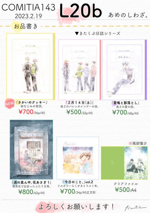 2/19(日) #COMITIA143 ▼お品書き等のお知らせ サークル名:あめのしわざ。 スペース: L20b 🍪新作『さかいのクッキー』#きたくぶ日誌 シリーズ3冊目を発行します。幼なじみの昔話です。最高です。(サンプルは引用RTを参照ください) よろしくお願いいたします🌷 #コミティア143 twitter.com/danpee88/statu…