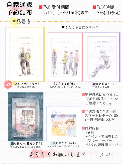 2/19(日) #COMITIA143 ▼お品書き 🍪新刊『さかいのクッキー』 男子高校生4人が放課後集まってゆるりと過ごす #きたくぶ日誌 シリーズ3冊目発行します。幼なじみふたりの過去編です。サンプルは引用RTをご参照ください。イベント後、本編全てあげます。本のみおまけ収録有。よろしくお願いします🌸 twitter.com/danpee88/statu…