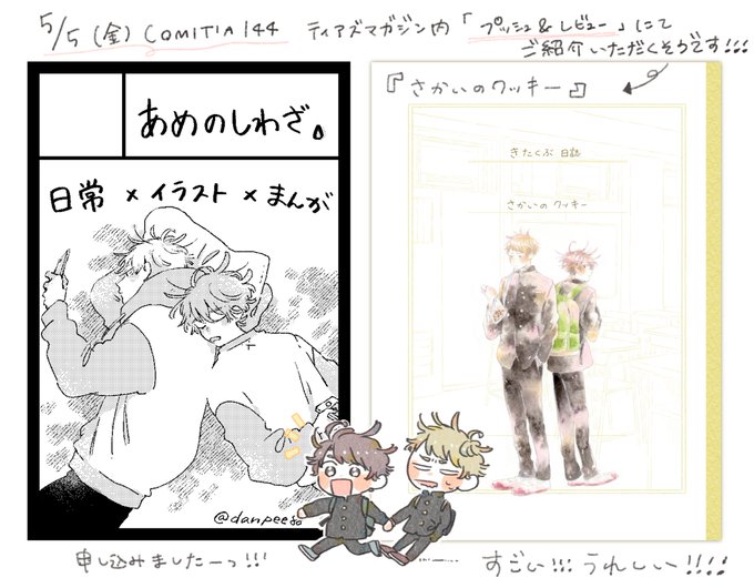 脱稿しました🥳やったー!!🕺💃 先日リメイクしたお話を、2/20(日) #COMITIA139 にて頒布予定です。描き下ろしあります。(▼サンプルぺたり)表紙めちゃくちゃかわいいです。よろしくお願いします🍪 #きたくぶ日誌 twitter.com/danpee88/statu…