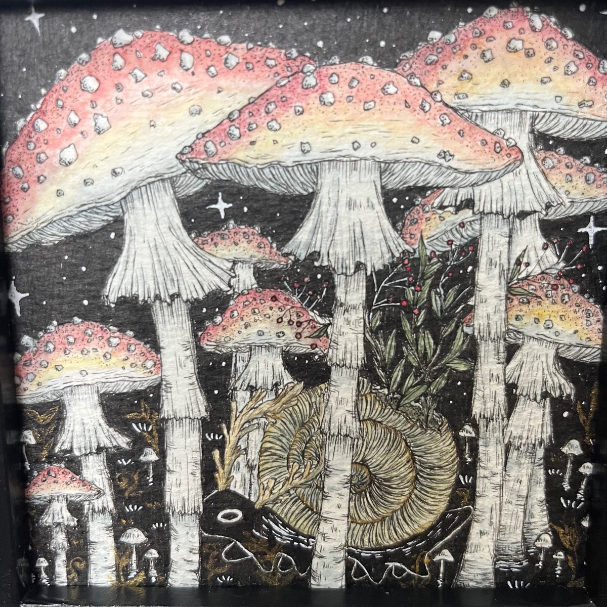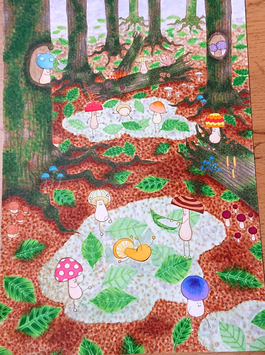 雨に濡れた森でよろこぶ きのこの妖精たち✨🍄 実はきのこが雨を降らせているってゆう仮説があるらしいですね! 不思議がいっぱいのきのこ(`・ω・) #きのこ #きのこイラスト #オリジナルイラスト #アナログイラスト #コピックイラスト #オリジナルキャラクター #カラフルイラスト