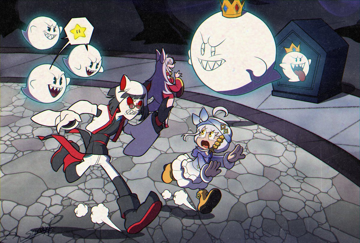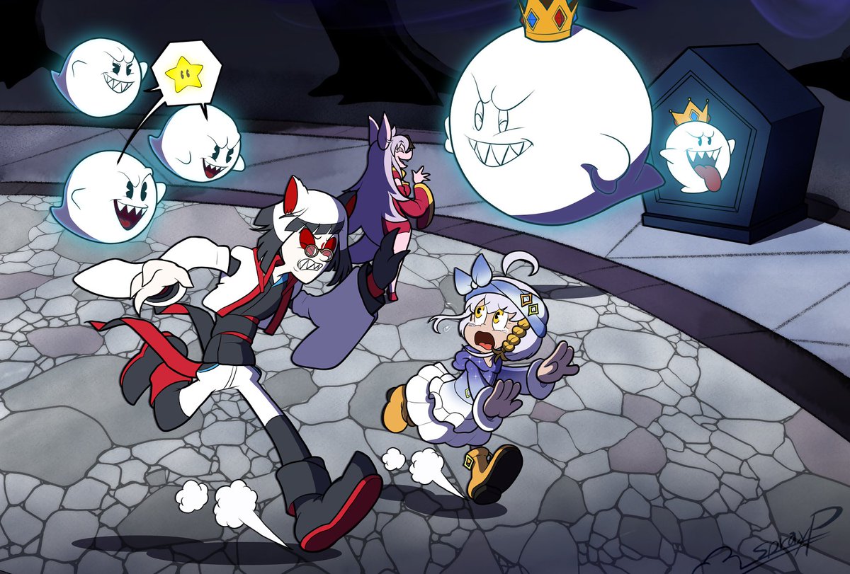 【Vtuberオールスター】 3枚目:マリオパーティスーパースターズ【ステージ】「ホラーランド」 白狐ロウ【@ByakkoLo_VCW】#とある作家の日常画 ミリル・シャムシルル【 @miriru_sham 】#ミリルかいた 狐岳きの【@kodake_kino 】#きののお札 ミリルちゃんオバケが嫌いだから テレサ達から逃げてそう。