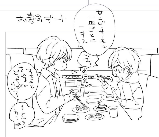 はくおみお寿司デート大好きだな〜🍣💕笑 \ただ今デート中/>RT 桜海が甘エビとサーモンばっかり食べるので映空が新ルール提案した様子を描いてみました(雑絵でごめんなさい〜)断る隙を与えない映空です #きみ色に汚されたい