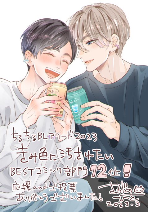 皆様の温かい応援のおかげで入賞できました㊗️長らく商業で描かせて頂きこんな日が来るとは本当に感激です🙏🏻✨ありがとうございます!! 桜海(受)つい先日20歳の誕生日を迎えたので初めてのお酒で祝杯🍻(描いてみたら笑い上戸だった😁) #BLアワード2023 BESTコミック部門 #きみ色に汚されたい