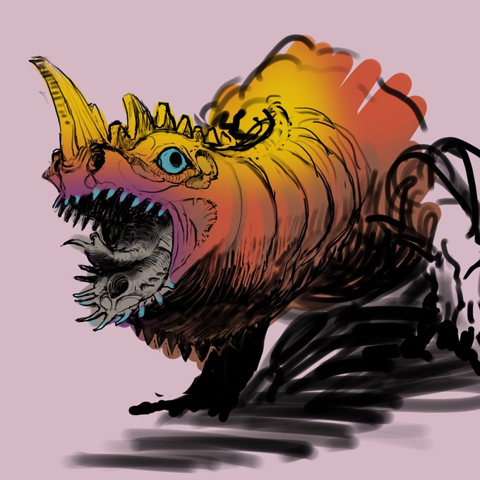 なんだか目に生気がないドラゴン 皮膚は硬質のゴムのような質感で、簡単には刃が通らない 舌の下にある分泌腺から可燃性の液体を放射して、そこに着火して周囲を火の海にする 翼を持たず、飛行能力は完全にない #きもちわるめドラゴン同好会
