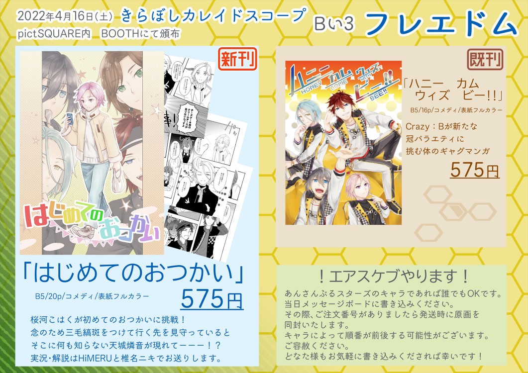 2022.4.16 21:00〜開催のwebオンリー「きらぼしカレイドスコープ」に参加します! pictsquare.net/gmepurnxadsz26… 紅月がルームシェアする新刊を頒布します。当日のお品書きと新刊サンプル及び注意点はツリーにて。 新刊関係なく遊びに来ていただけると嬉しいです!よろしくお願い致します🌸 #きらかれ