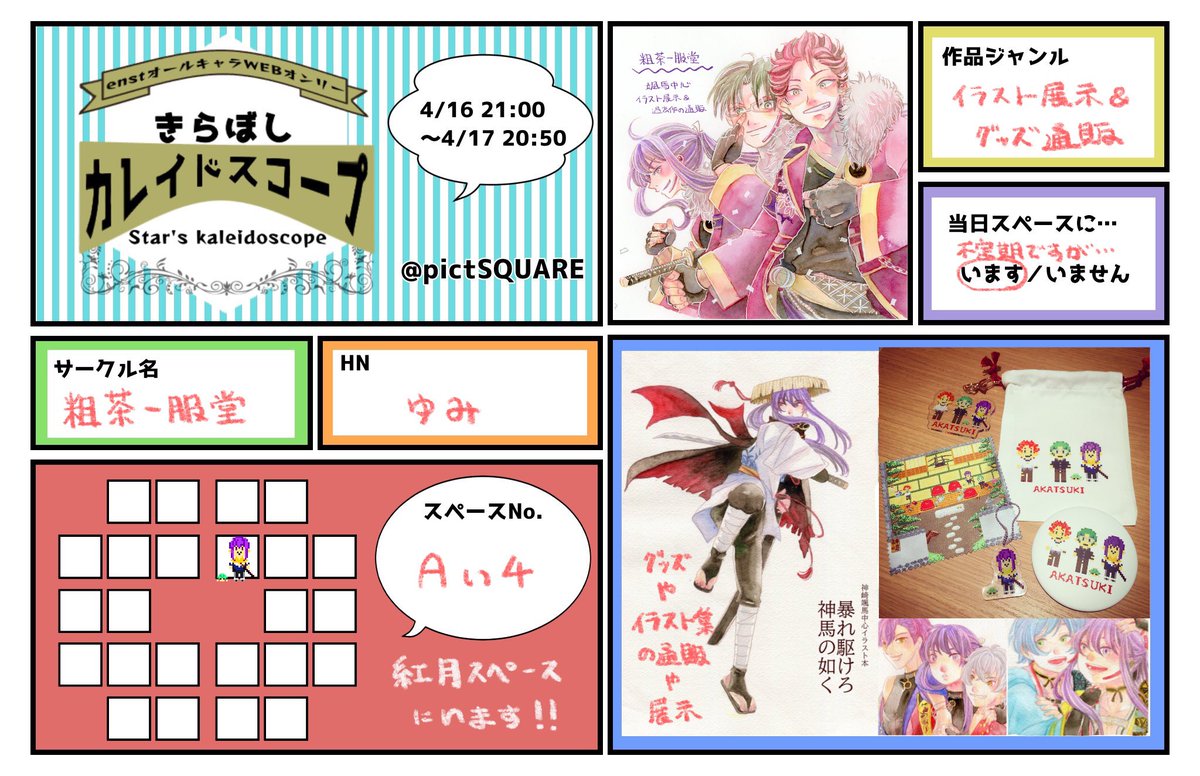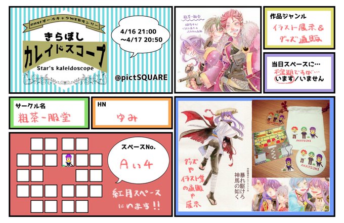 【宣伝】 2022年4/16(土)21:00〜4/17(日)20:50 enstオールキャラWebオンリー きらぼしカレイドスコープ pictsquare.net/gmepurnxadsz26… に、紅月(颯馬)メインで参加し〼 グッズと3冊目のイラスト集の通販、過去イラスト集や間に合わなかった紅月本に掲載予定のイラスト一部展示を予定しており〼 #きらかれ
