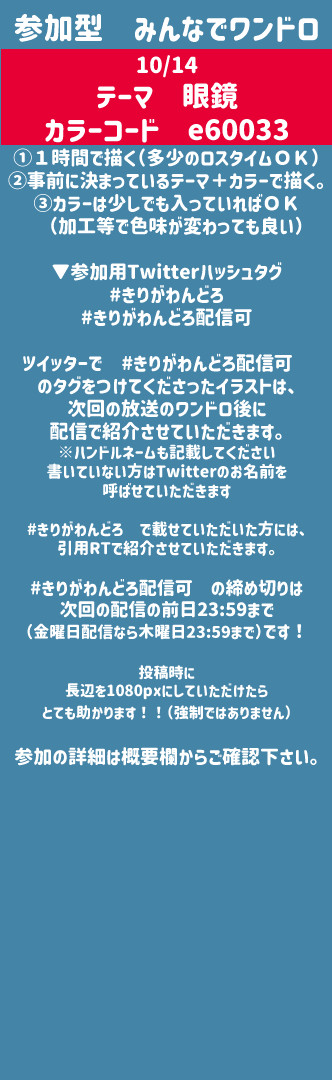 【厚塗りお絵描き配信】 みんなでワンドロ!お題:眼鏡&e60033 10/14 youtu.be/qouUuQzGFm0 視聴者参加型のワンドロ配信始まりました!サムネイルは先週の私のワンドロ!よろしくお願いします! #お絵描き配信 #きりがわんどろ