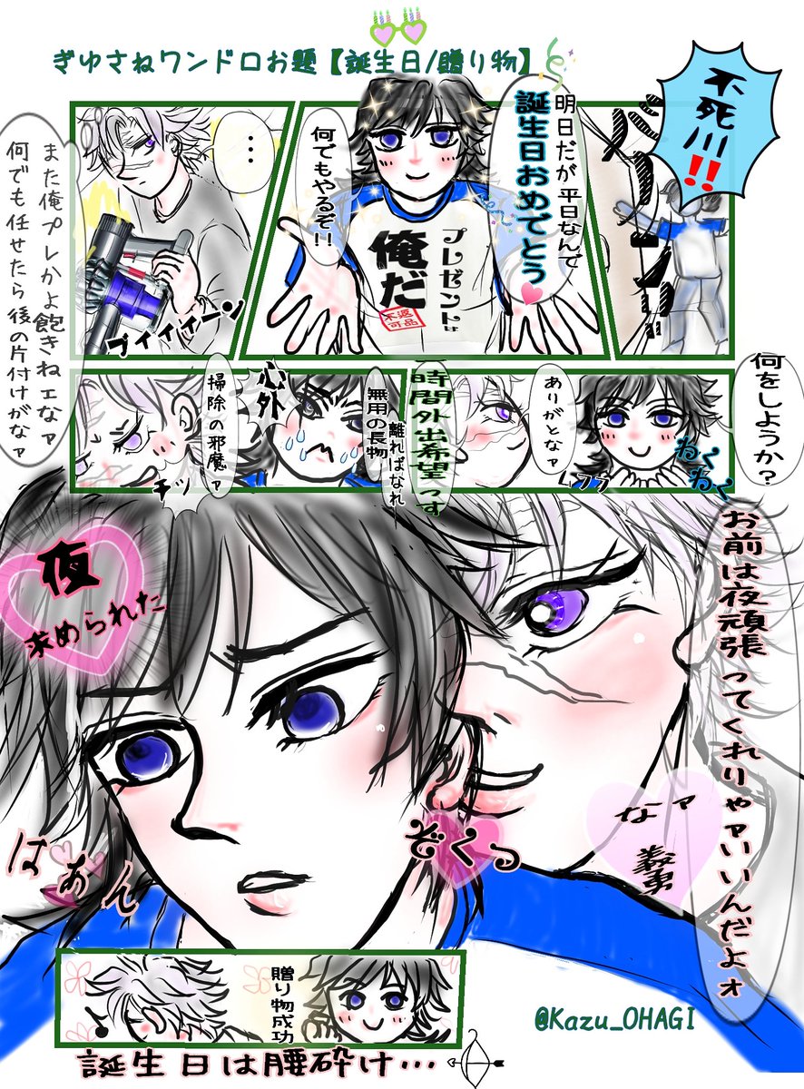#ぎゆさね版深夜の真剣60分一本勝負 管理人様いつも開催有難うございます 今週のお題【贈り物/誕生🎂日】 お借りしました 遅れましたが…さね誕🎂 *キ学軸(同!棲5年目ぎゆさね) *毎年『俺がプレゼント👕』で 自分あぴーるするぎゆ…料理も掃除もヘタ💙💚 #ぎゆさね